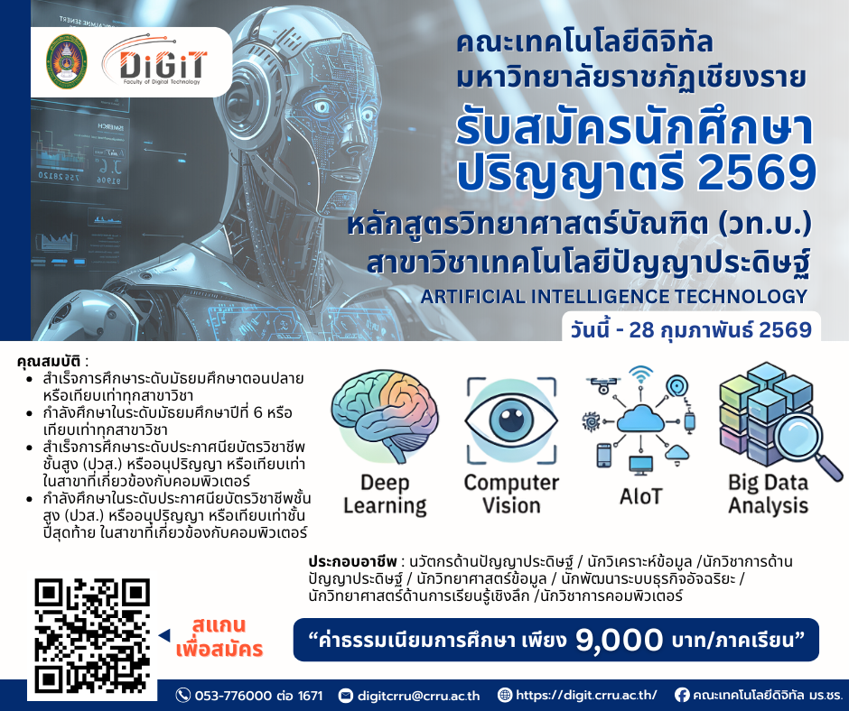 คณะเทคโนโลยีดิจิทัล มหาวิทยาลัยราชภัฏเชียงราย คือศูนย์กลางการเรียนรู้ด้านเทคโนโลยีแห่งภูมิภาคเหนือ ที่มุ่งผลิตบัณฑิตคุณภาพให้พร้อมก้าวสู่โลกดิจิทัลอย่างมืออาชีพ เรามุ่งสร้างผู้เชี่ยวชาญที่มีทั้งทักษะเชิงเทคนิค ความคิดสร้างสรรค์ และคุณธรรมควบคู่กัน เพื่อให้สามารถขับเคลื่อนสังคมและตอบโจทย์ตลาดแรงงานยุคใหม่ได้อย่างแท้จริง