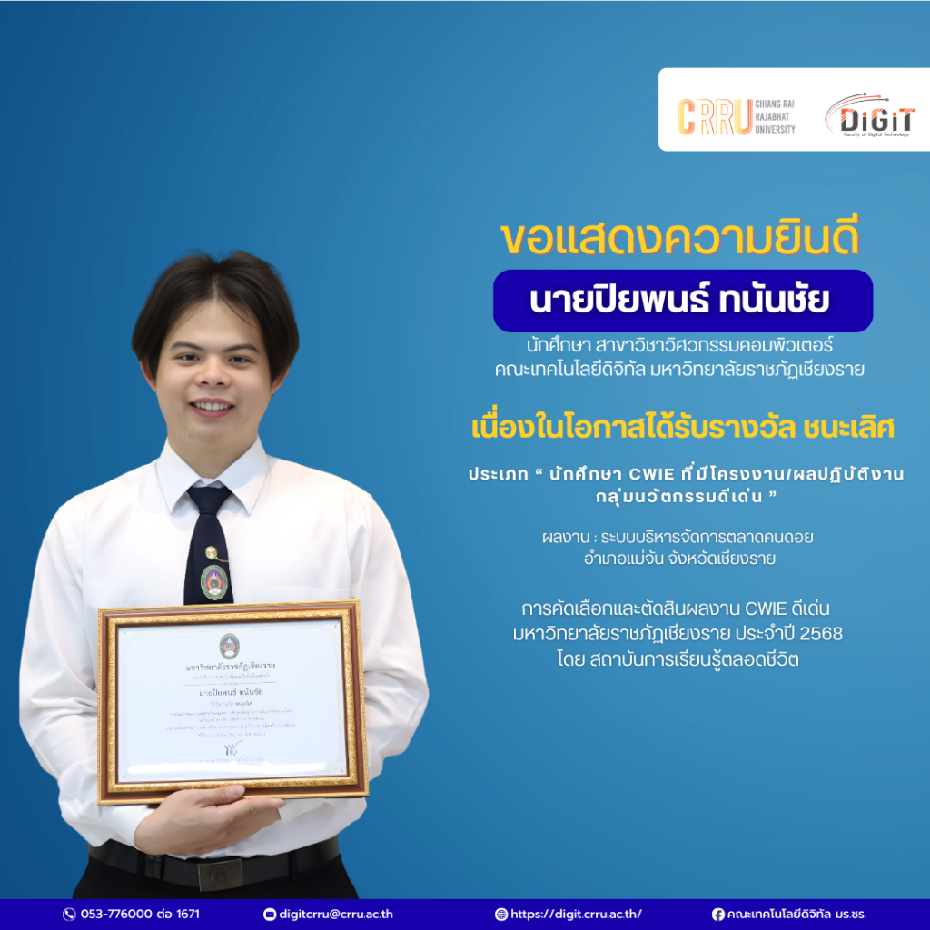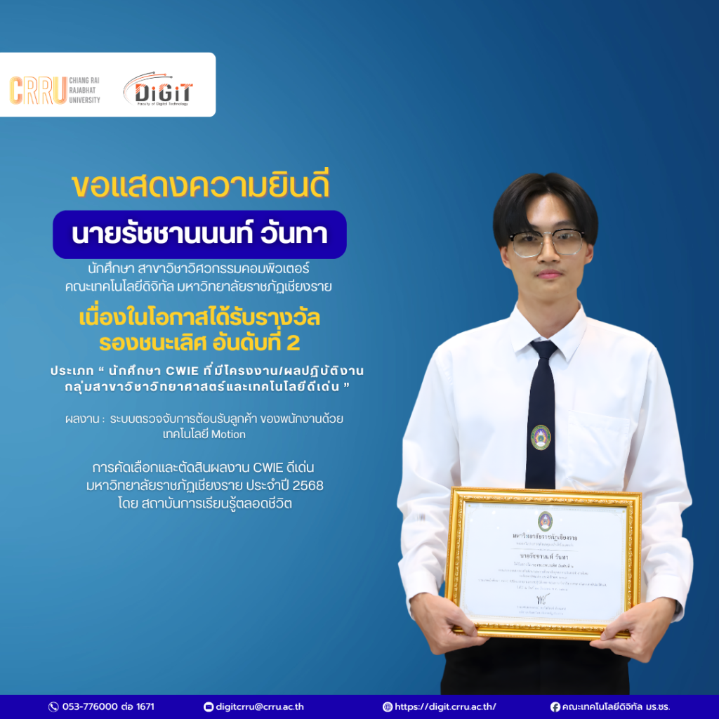 คณะเทคโนโลยีดิจิทัล ขอแสดงความยินดีและชื่นชมในความสำเร็จอันน่าภาคภูมิใจของนักศึกษาทั้งสองท่าน มา ณ โอกาสนี้